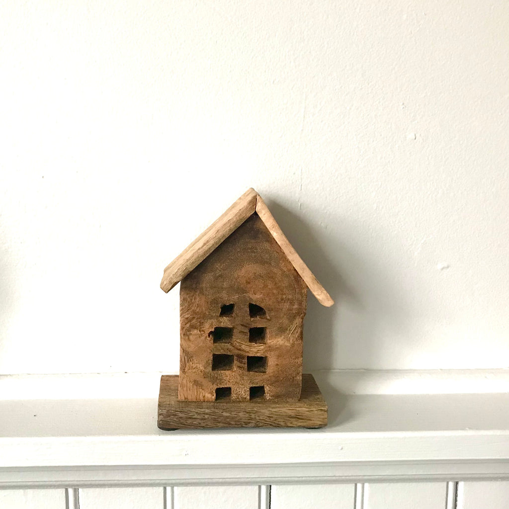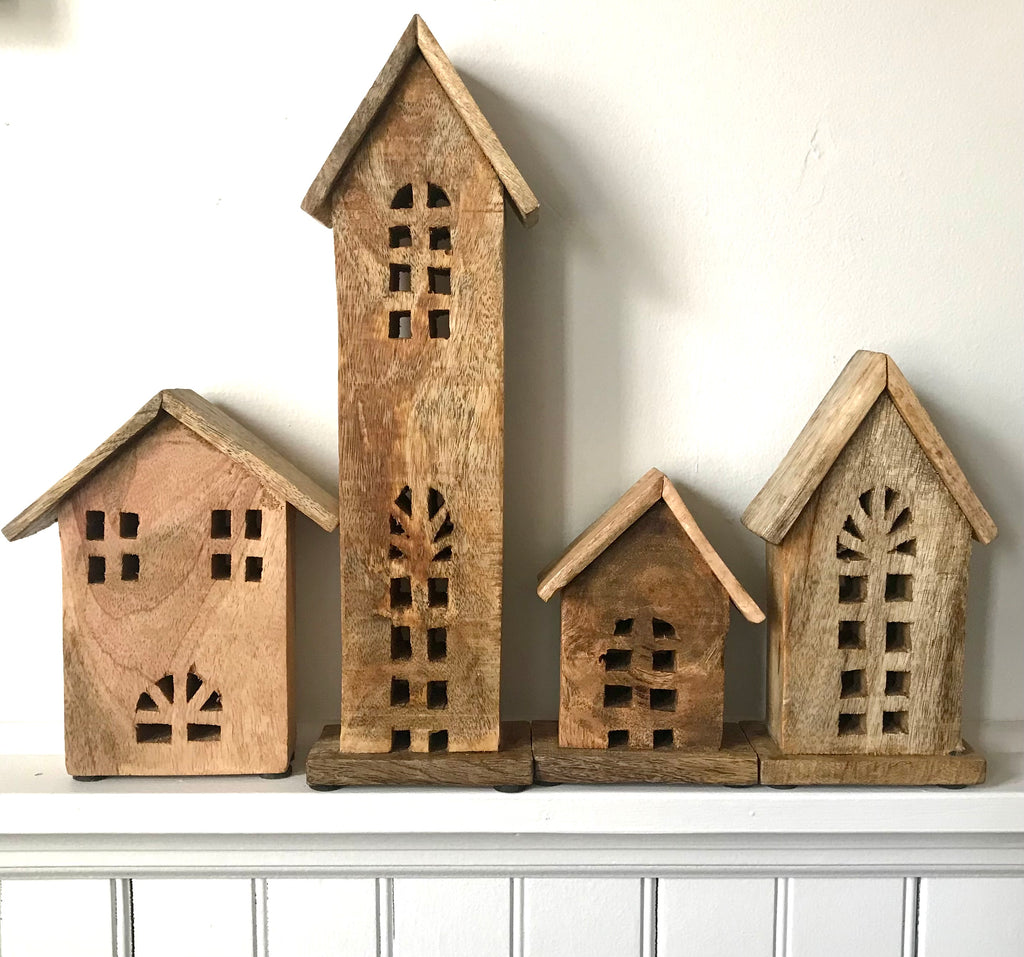Handcrafted, these charming wood houses come in four styles. Alone, or as a grouping they add charm and natural texture to your holiday season decor.